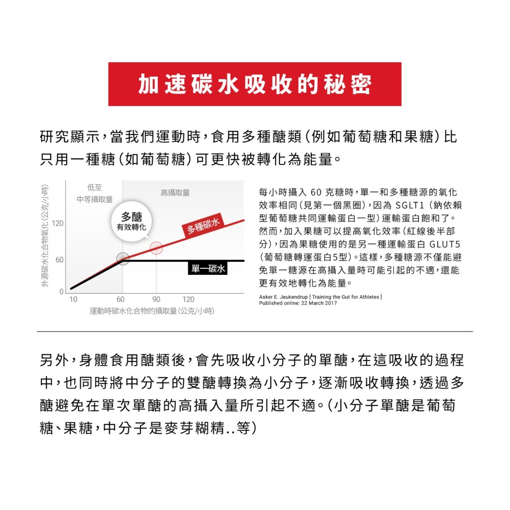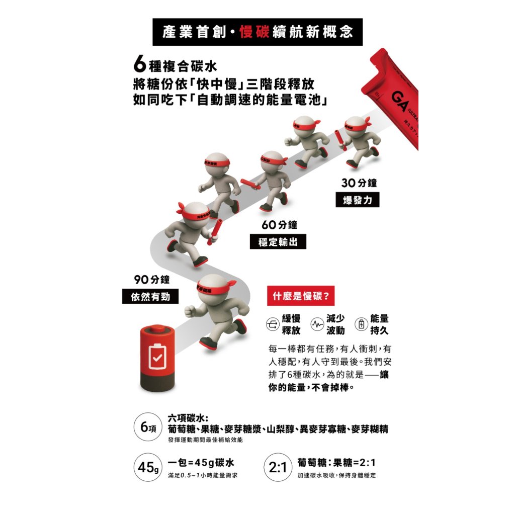 ・ 產業首創!慢碳新概念 :六大複合型碳水,易消化,吸收效率更佳,進而提供續航持久的能量供應。